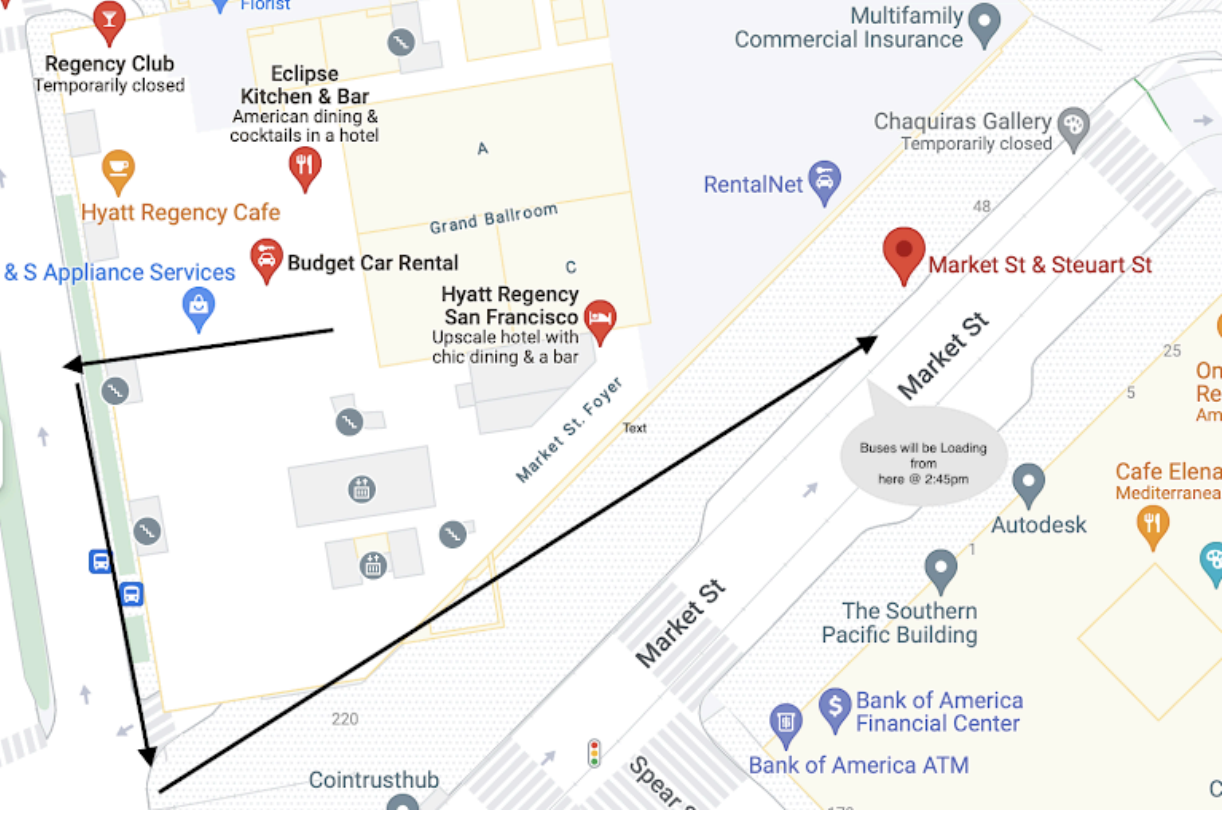 When exiting the regency hotel, take a left toward market and then take a left at market. Shuttles will be departing 15 minutes after loading.